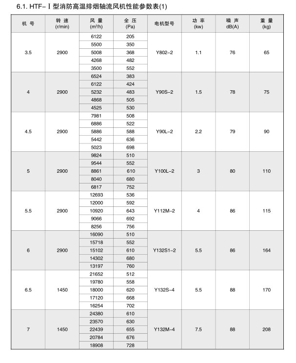 例:HTF—SX№5代表消防排煙軸流風(fēng)機(jī)配雙速電機(jī)和消聲器,葉輪直徑500mm。